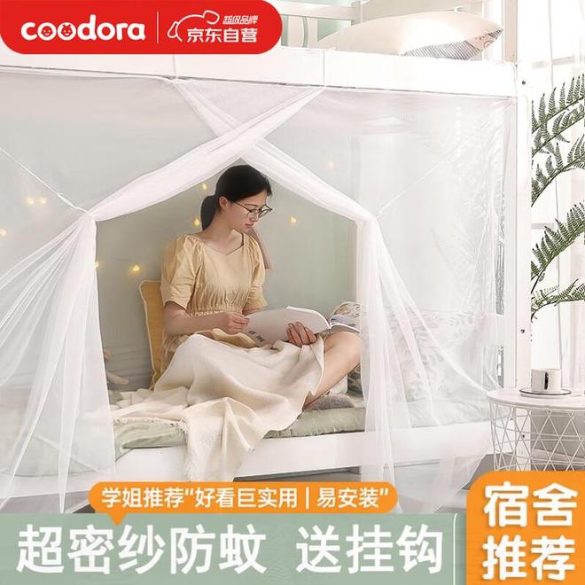 网眼密度决定防蚊效果普通蚊帐网眼太大,小体型蚊子照样能钻进来。专业宿舍蚊帐采用加密网眼设计,孔径小于1mm,连最小的库蚊都无隙可乘。比如COODORA这款蚊帐,采用32目加密网布,实测连果蝇都飞不进去,防蚊效果直接拉满